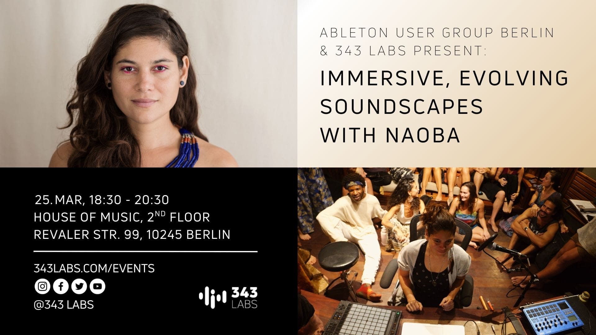 House of Music Revaler Str. 99, Berlin, Berlin, Germany343 Labs Berlin is proud to welcome NAOBA as part of our Visiting Artist Masterclass series! In this workshop, NAOBA will share her process of building Ableton Live templates that […]